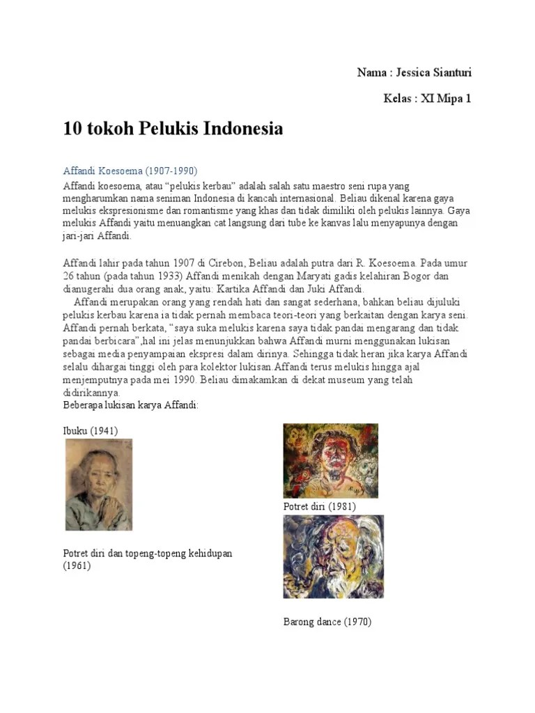 Salah satu pelukis yang cukup populer di indonesia adalah affandi. Terkenal di dunia internasional berkat gaya ekspresionisnya yang khas. Koesoema, seorang mantri ukur di pabrik gula di ciledug, cirebon. Pelukis yang meraih gelar doktor honoris causa dari university of singapore tahun … 04/12/2021 · ia dikenal sebagai pelukis indonesia pertama pada abad 20.